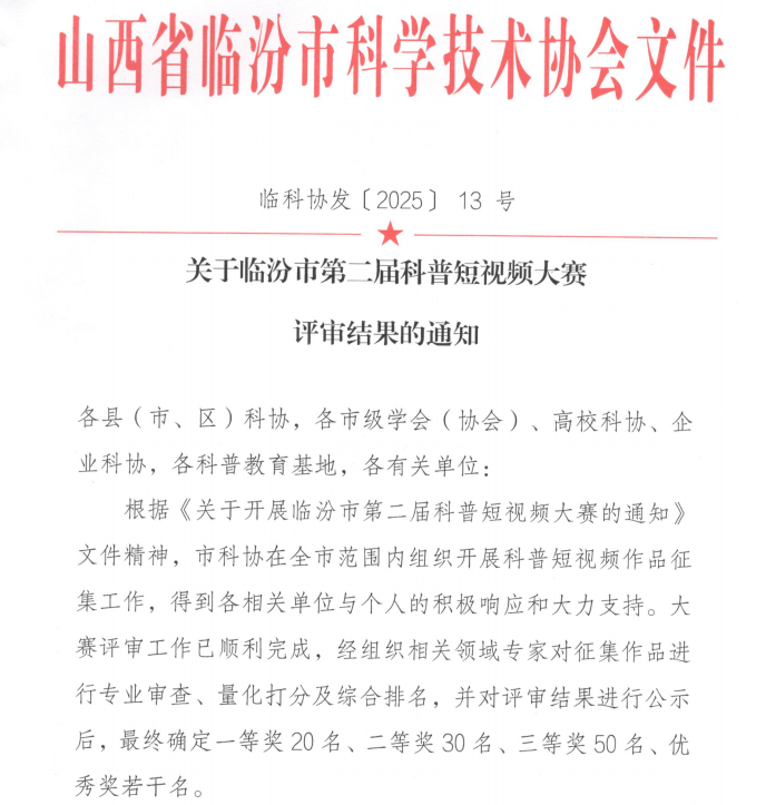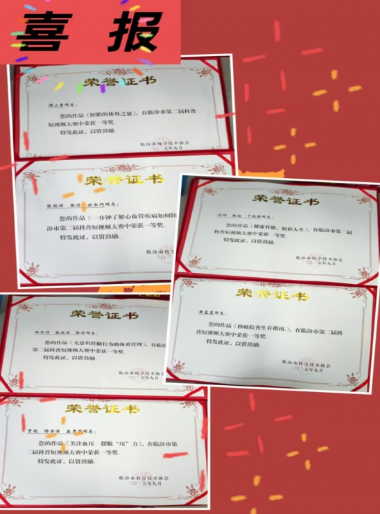 近日,市科协组织开展临汾市第二届科普视频大赛,面向全市范围科技工作者、高校师生、中小学青少年、科普爱好者征集科普作品。经过组织相关领域专家审核、评审、公示等环节,评选出获奖作品。我院多个科普视频作品以专业的角度、脱俗易懂的形式荣获一等奖6项,二等奖13项,三等奖19项,多项优秀奖。