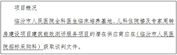 采购需求:临汾市人民医院全科医生临床培养基地、儿科住院楼及专家周转房建设项目建筑能效测评服务,需要进行能效测评相关检测、编制建筑能效测评报告,协助采购人完成项目节能验收工作。详见谈判文件。