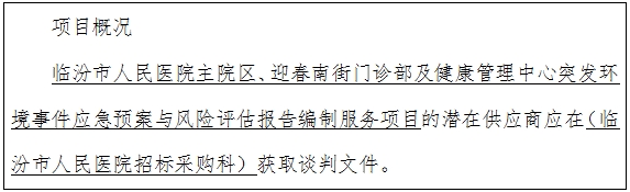 采购需求:为临汾市人民医院提供专业技术服务,通过技术审查、专家论证,完成临汾市人民医院主院区、健康管理中心编制突发环境事件应急预案与风险评估报告及迎春南街门诊部编制突发环境事件应急预案与风险评估报告,并完成突发环境事件应急预案备案,详见谈判文件。