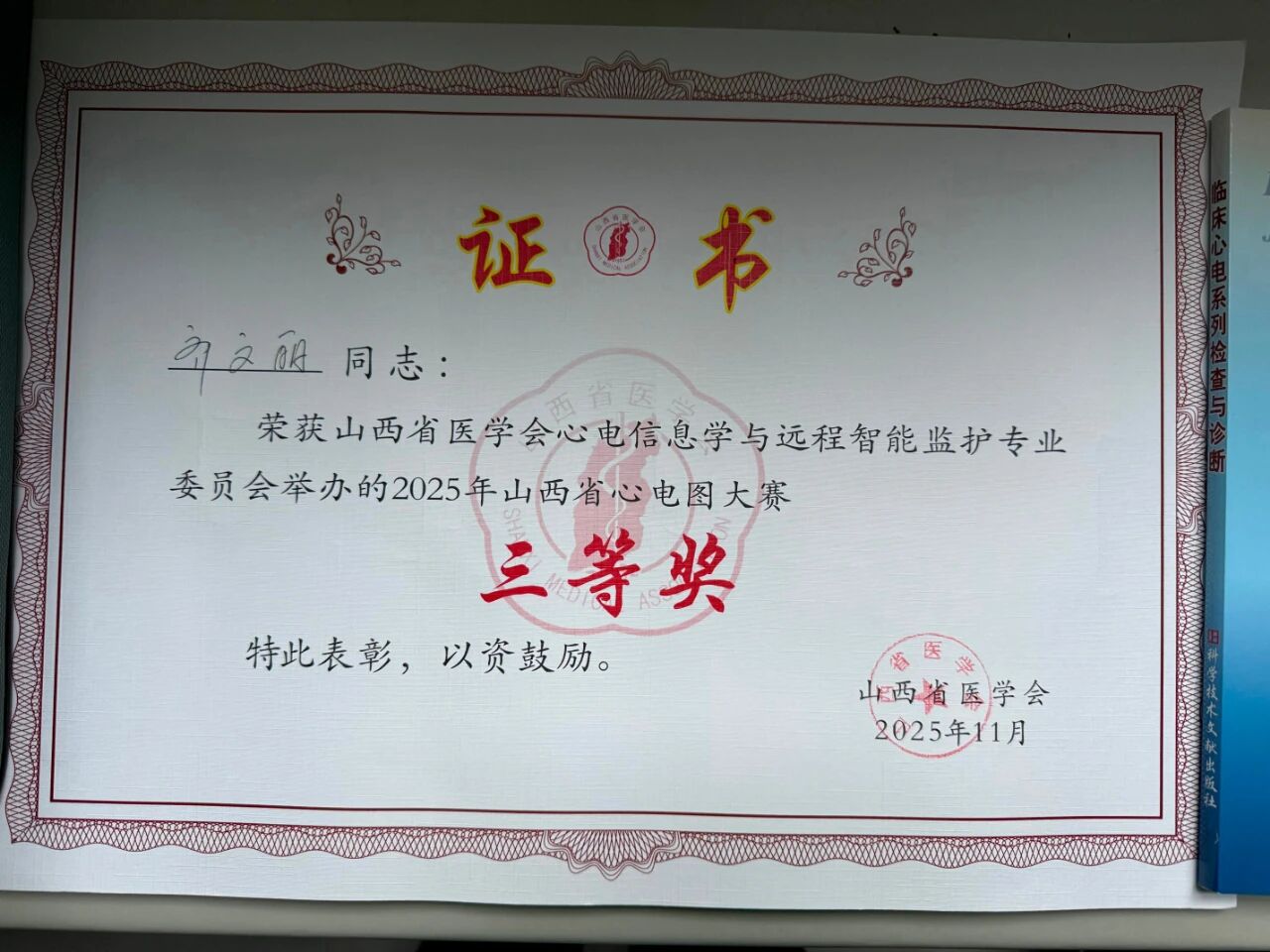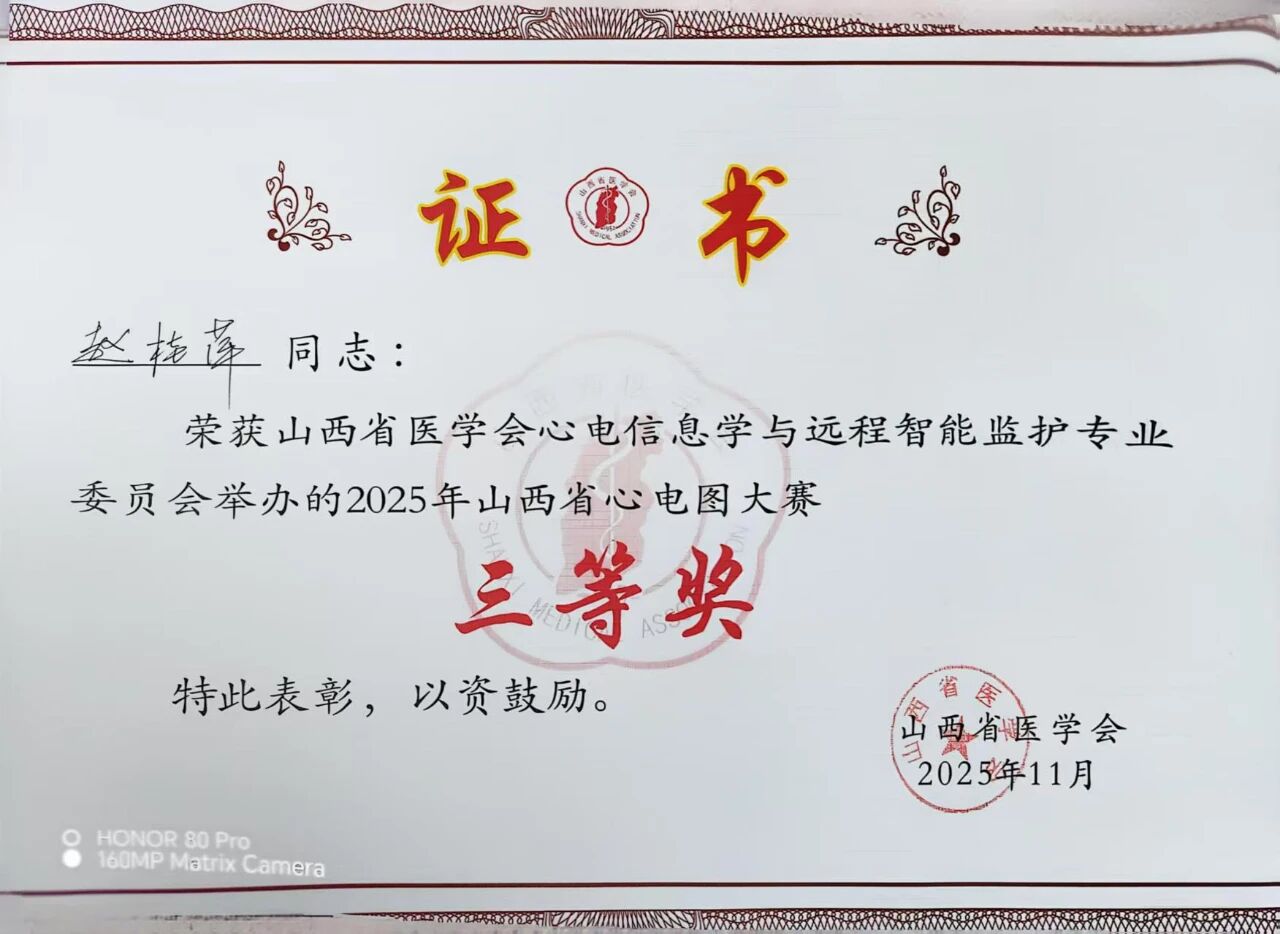 日前,由山西省医学会心电信息学与远程智能监护专业委员会主办的“2025年山西省心电图大赛”在太原举行。本次大赛共有来自全省各级医疗机构的19支队伍参赛,我院心电诊断室齐文丽、赵桂萍凭借丰富的工作经验、精湛的专业技能以及严谨的阅图思维,在角逐中荣获三等奖。