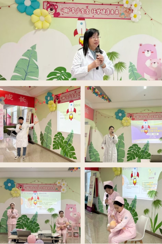 温荣华主任讲解早产儿出院后随访要点;孟献芳副主任医师分享科学喂养与体重追赶方法;刘亚楠主治医师解析乳糖不耐受、牛奶蛋白过敏的区分与应对;李淼淼、辛晶晶2位护士分别讲解袋鼠式护理及早产儿家庭护理核心要点,同步演示家庭护理实操,并通过互动为家长答疑解惑并现场发放专属小礼品。