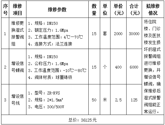 采购需求:保障医院消防安全,为患者提供安全稳定的就诊环境,现对医院住院楼、门诊楼及医技楼等处的湿式报警阀组维修及更换。