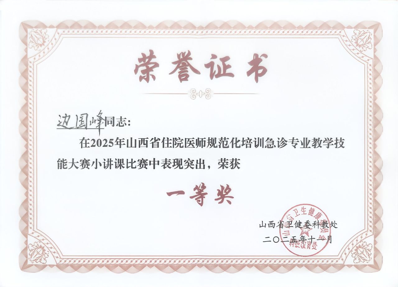 11月23日,由山西省卫生健康委员会主办的山西省住院医师规范化培训急诊科骨干医师培训暨教学技能竞赛圆满落幕,我院急诊科专业基地带教老师边国峰荣获竞赛一等奖。