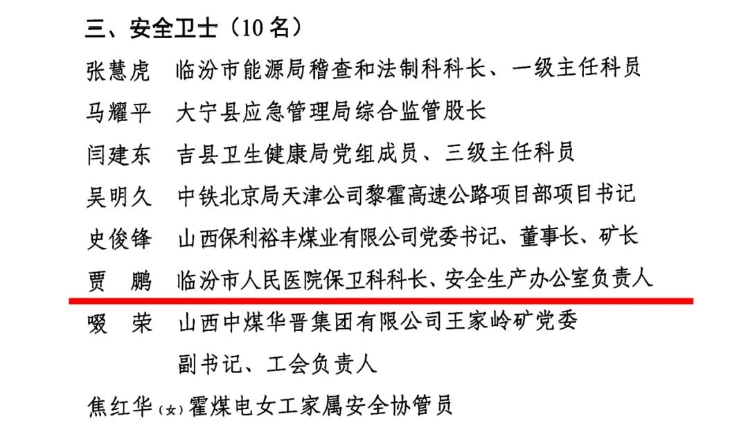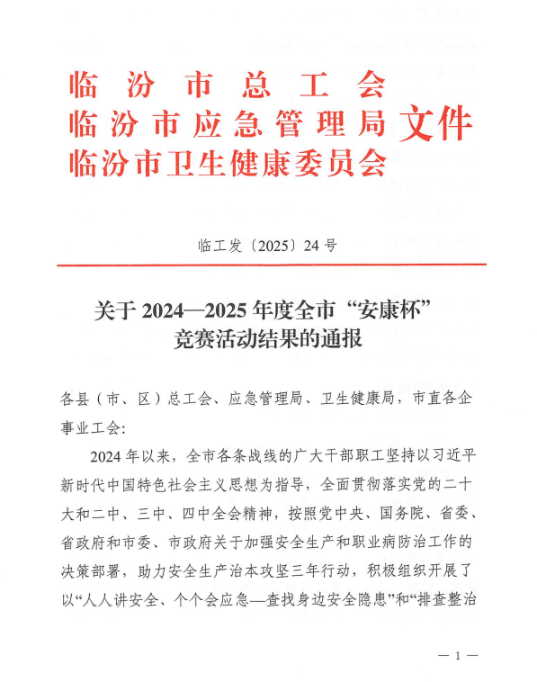 近日,临汾市总工会、临汾市应急管理局、临汾市卫生健康委员会联合印发《关于2024—2025年度全市“安康杯”竞赛活动结果的通报》(临工发〔2025〕24号),临汾市人民医院凭借在安全生产领域的突出表现,荣获殊荣,其中贾鹏同志被授予“安全卫士”称号,彰显了我院在构建安全管理体系、保障医患安全方面的卓越成效。