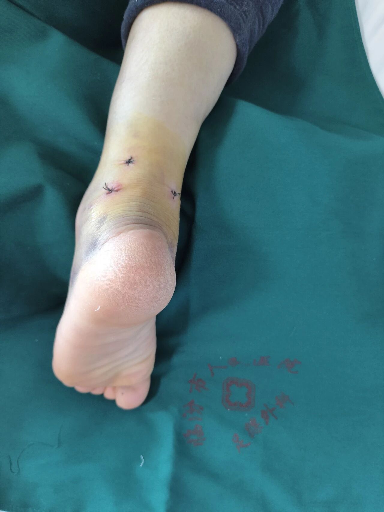 传统开放手术需要在足底切 6~8 cm 的口子,瘢痕大、恢复慢。此次,团队采用踝关节镜后内侧入路,仅开 3个7 mm小孔: