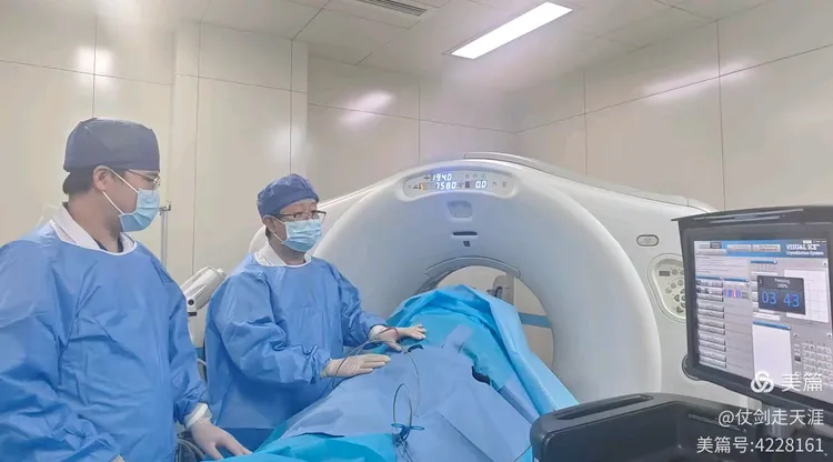 患者肺癌晚期发生腰椎转移,腰部及腿部每天都感觉剧烈疼痛,不能下床,经治疗团队讨论后最终制定了氩氦刀冷冻消融方案。手术过程中,介入治疗科副主任医师范利斌在CT引导下将氩氦刀精准插入腰椎椎体病灶,通过快速冷冻和复温,成功地将肿瘤组织摧毁,同时最大限度地保护了周围正常组织。术后第二天,患者腰腿部疼痛明显缓解。