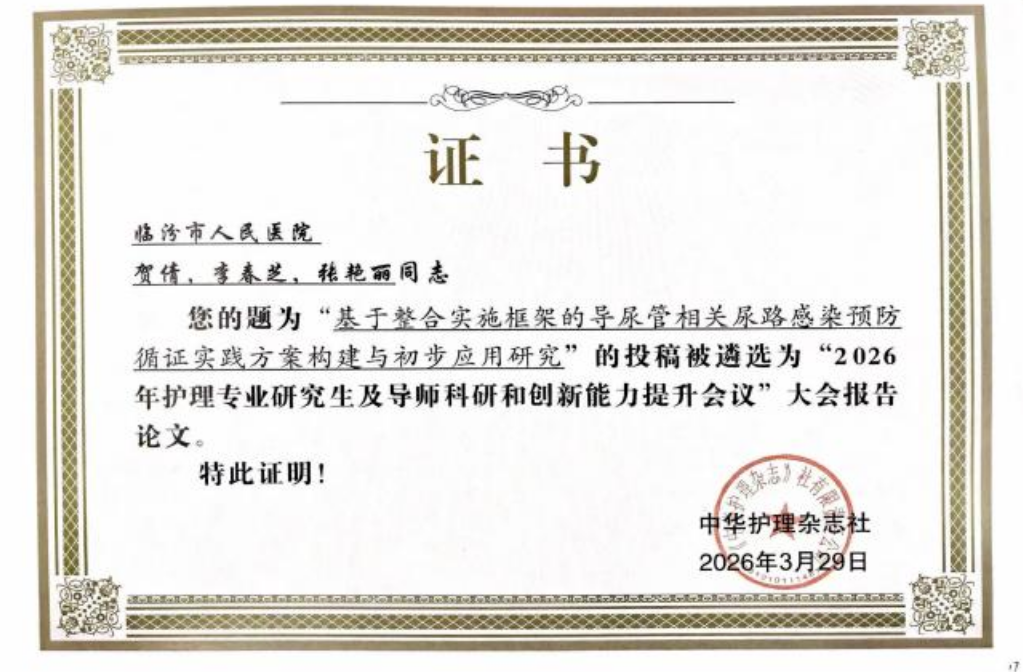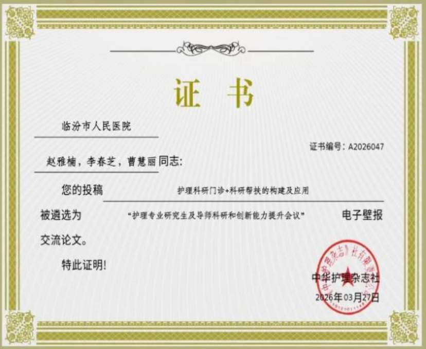 一直以来,我院将科研人才培养作为学科发展核心抓手,完善多元培养体系、强化创新科研支撑,助力职工成长为“临床+科研”双优型人才。未来,我院将持续搭建学术交流平台,鼓励护理人员深耕科研、勇于创新,以科研赋能护理服务提质增效,为守护群众健康贡献力量。
