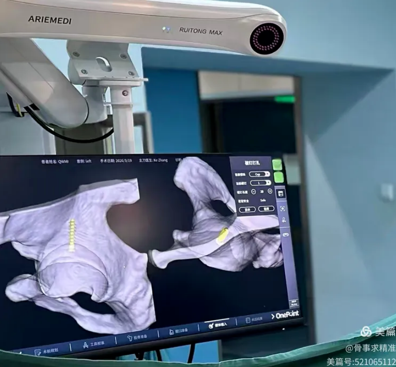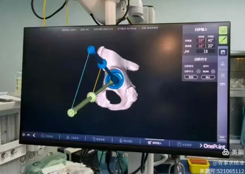 在全髋关节置换中,机器人实现髋臼磨挫深度、角度、臼杯前倾角、外展角完全量化,置钉方向与深度实时可视监测。尤其在DDH发育不良、髋关节翻修等解剖变异复杂病例中,精准导航能够降低手术风险,提高假体稳定性与长期生存率。