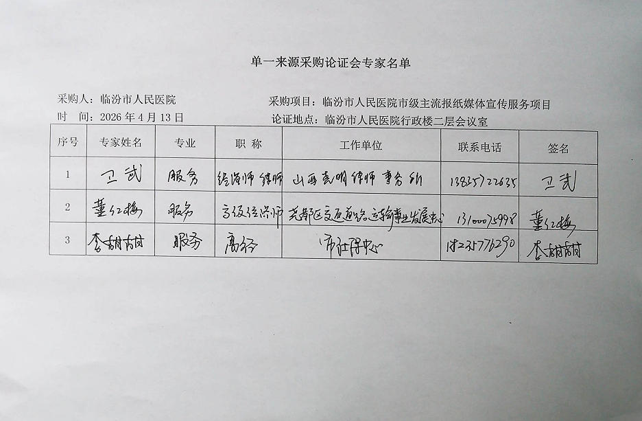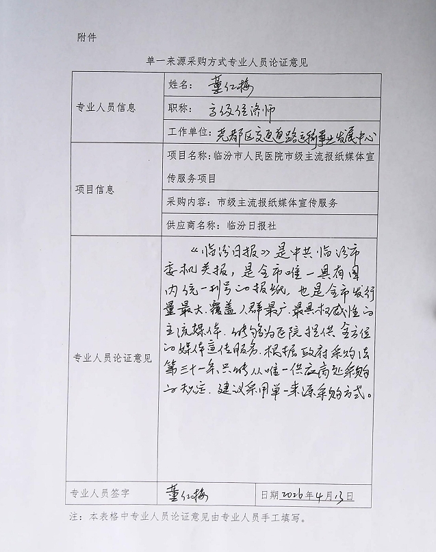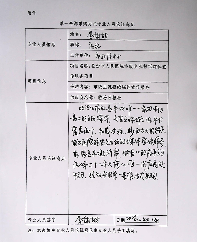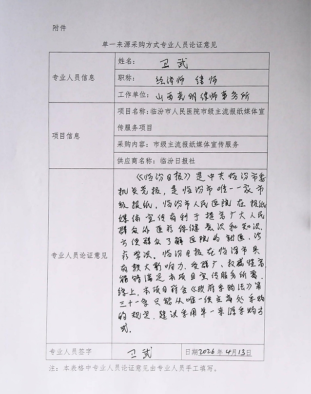 4、采用单一来源采购方式的原因及说明:临汾日报社是中共临汾市委机关报,是全市唯一具有国内统一刊号且平台覆盖面广、权威性强、影响力大的主流报纸媒体。能够为医院提供全方位的媒体宣传服务,方便群众了解医院的就医、诊疗常识,为满足本项目宣传服务所需,实施单一来源采购。