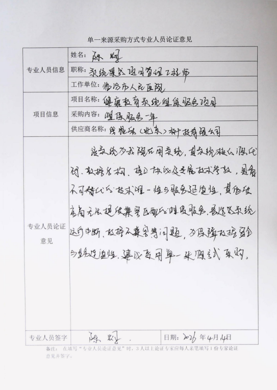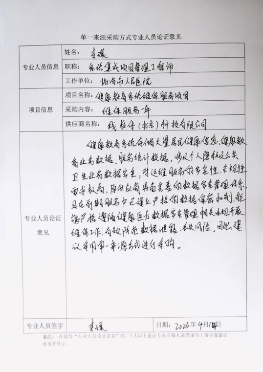 4、采用单一来源采购方式的原因及说明:医院健康教育系统为医院再用系统,其系统核心源代码、数据结构、接口协议及专属技术参数具备不可替代的技术唯一性与服务延续性,且该系统业务数据、服务统计数据涉及个人隐私及公共卫生业务数据安全,原供应商具备完善的数据安全管理体系及保密机制,为确保系统平稳安全运行及业务连续性,实施单一来源采购。