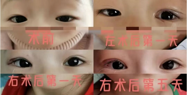2.二期手术(右侧重度上睑下垂矫正):在左侧手术恢复良好的基础上,团队为患儿实施同术式的右侧矫正治疗。术后患儿双眼睑裂高度对称,睁眼无力症状得到明显改善,眼睑闭合功能完好,顺利度过术后恢复期,目前已顺利出院。